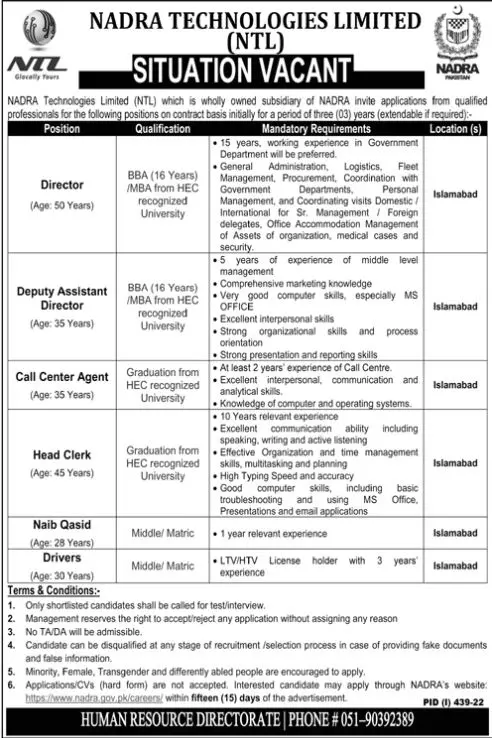 Currently, the NTL is seeking applications for the recruitment of a Director, Deputy Assistant Director, Call Center Agent, Head Clerk, Naib Qasid, and Driver.
