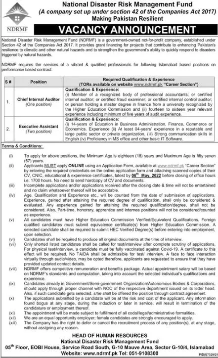 Jobs In National Disaster & Risk Management Fund announce the Contract career opportunities for the post of See Below Ad in Federal, Islamabad for the fresh and experienced candidates on Contract basis who have Check Advertisement degree. Posted date of this post is 19/04/2022 and the last date is 06/05/2022. if you are eligible for this job apply before due date.