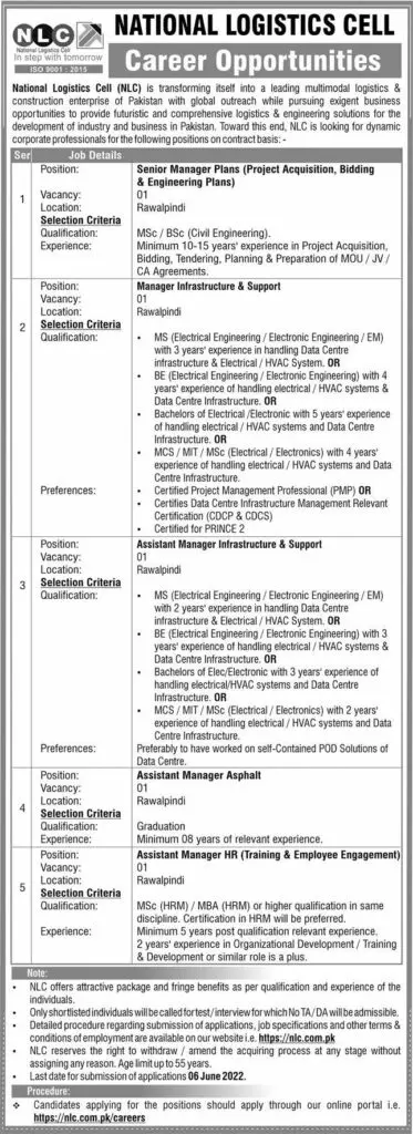 Jobs in National Logistics Cell NLC 2022 announce the Contract career opportunities for the post of See Below Ad in Punjab, Rawalpindi for the fresh and experienced candidates on Contract basis who have Check Advertisement degree. Posted date of this post is 22/05/2022 and the last date is 06/06/2022. if you are eligible for this job apply before due date.
