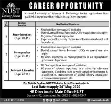 Jobs in National University Of Sciences And Technology announce the Contract career opportunities for the post of See Below Ad in Federal for the fresh and experienced candidates on Contract basis who have Check Advertisement degree. Posted date of this post is 12/05/2020 and the last date is 24/05/2020. if you are eligible for this job apply before due date.