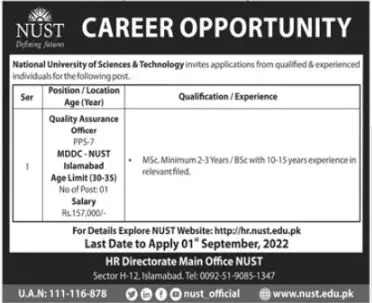 These NUST Jobs 2022 are open for Graduates and Master’s degree holders in the relevant fields. Check complete details of NUST Graduate Jobs 2022 and NUST Master Jobs 2022. Currently, this position is open for Quality Assurance Officer.