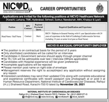 Jobs in NICVD Healthcare Karachi announce the Contract career opportunities for the post of check the advertisement in Sindh,Karachi for the fresh and experienced candidates on Contract basis who have Check Advertisement degree. Posted date of this post is 15/11/2021 and the last date is 29/11/2021. if you are eligible for this job apply before due date.