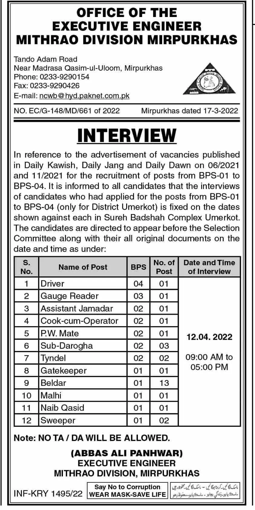 Jobs In office of the executive engineer Mirpurkhas announce the Permanent career opportunities for the post of See Below Ad in Sindh, Mirpurkhas for the fresh and experienced candidates on Permanent basis who have Check Advertisement degree. Posted date of this post is 24/03/2022 and the last date is 12/03/2022. if you are eligible for this job apply before due date.