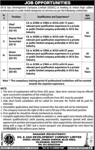 Jobs In Oil & Gas Development Company announce the Contract career opportunities for the post of See Below Ad in Federal, Islamabad for the fresh and experienced candidates on Contract basis who have Check Advertisement degree. Posted date of this post is 15/05/2022 and the last date is 31/05/2022. if you are eligible for this job apply before due date.