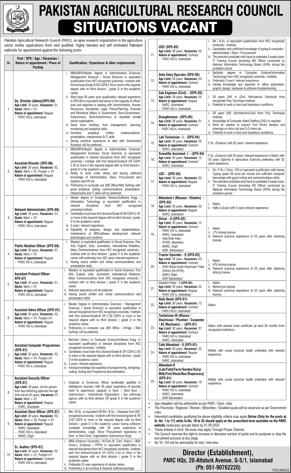 Jobs in Pakistan Agricultural Research Council PARC announce the Contract career opportunities for the post of See Below Ad in Federal, Islamabad for the fresh and experienced candidates on Contract basis who have Check Advertisement degree. Posted date of this post is 17/08/2022 and the last date is 31/08/2022. if you are eligible for this job apply before due date.