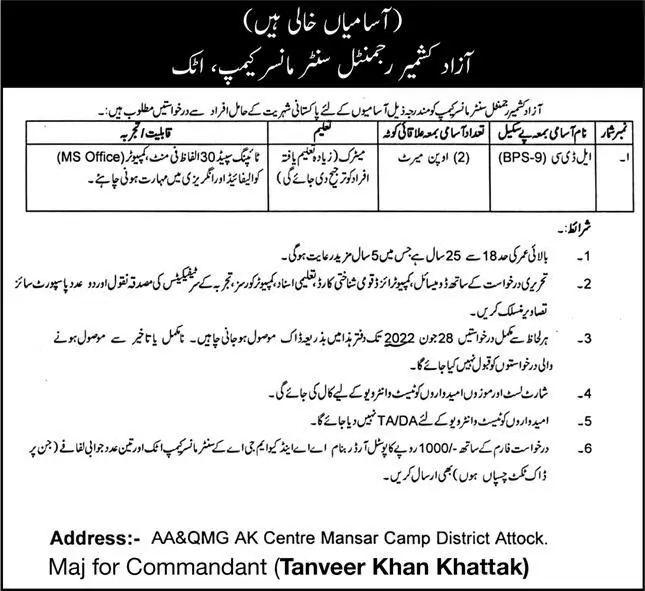 Jobs in Pakistan Army AK Center Mansar Camp Attock announce the Permanent career opportunities for the post of See Below Ad in Azad Jammu Kashmir, Attock for the fresh and experienced candidates on Permanent basis who have Check Advertisement degree. Posted date of this post is 22/06/2022 and the last date is 28/06/2022. if you are eligible for this job apply before due date.