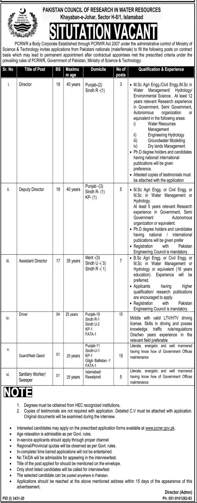 Jobs Pakistan Council of Research in Water Resources PCRWR Islamabad announce the career opportunities for the post of in for the fresh and experienced candidates on basis who have degree. Posted date of this post is 05/01/2021 and the last date is 17/01/2021. if you are eligible for this job apply before due date.