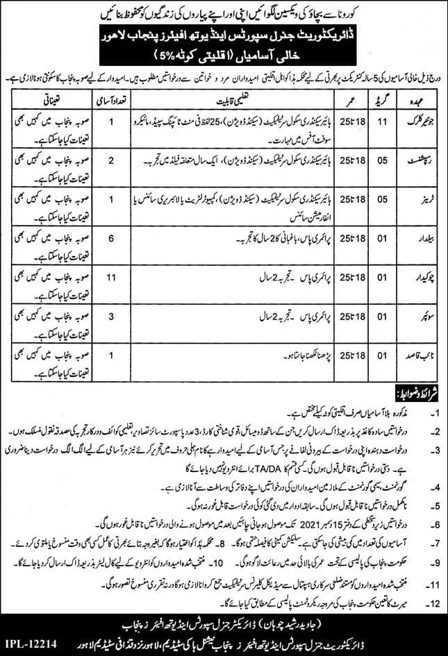 Jobs in Pakistan Directorate General Sports & Youth Affairs announce the Contract career opportunities for the post of See Below Ad in Punjab,Lahore for the fresh and experienced candidates on Contract basis who have Check Advertisement degree. Posted date of this post is 29/11/2021 and the last date is 15/12/2021. if you are eligible for this job apply before due date.