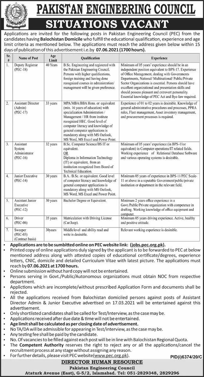 Jobs in Pakistan Engineering Council PEC announce the Permanent career opportunities for the post of See Below Ad in Federal for the fresh and experienced candidates on Permanent basis who have Check Advertisement degree. Posted date of this post is 23/05/2021 and the last date is 07/06/2021. if you are eligible for this job apply before due date.