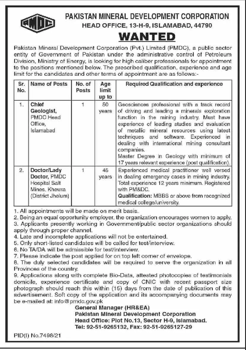 Jobs In Pakistan Mineral Development Corporation Islamabad announce the Contract career opportunities for the post of See Below Ad in Federal, Islamabad for the fresh and experienced candidates on Contract basis who have Check Advertisement degree. Posted date of this post is 25/04/2022 and the last date is 10/05/2022. if you are eligible for this job apply before due date.