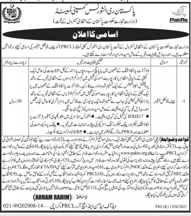 jobs in pakistan re-insurance karachi announce the Contract career opportunities for the post of chief financial officer in Pakistan for the fresh and experienced candidates on Contract basis who have Masters degree. Posted date of this post is 11/11/2021 and the last date is 26/11/2021. if you are eligible for this job apply before due date.
