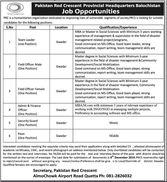 Jobs In Pakistan Red Crescent Society announce the Contract career opportunities for the post of See Below Ad in Balochistan for the fresh and experienced candidates on Contract basis who have Check Advertisement degree. Posted date of this post is 25/11/2019 and the last date is 08/12/2019. if you are eligible for this job apply before due date.