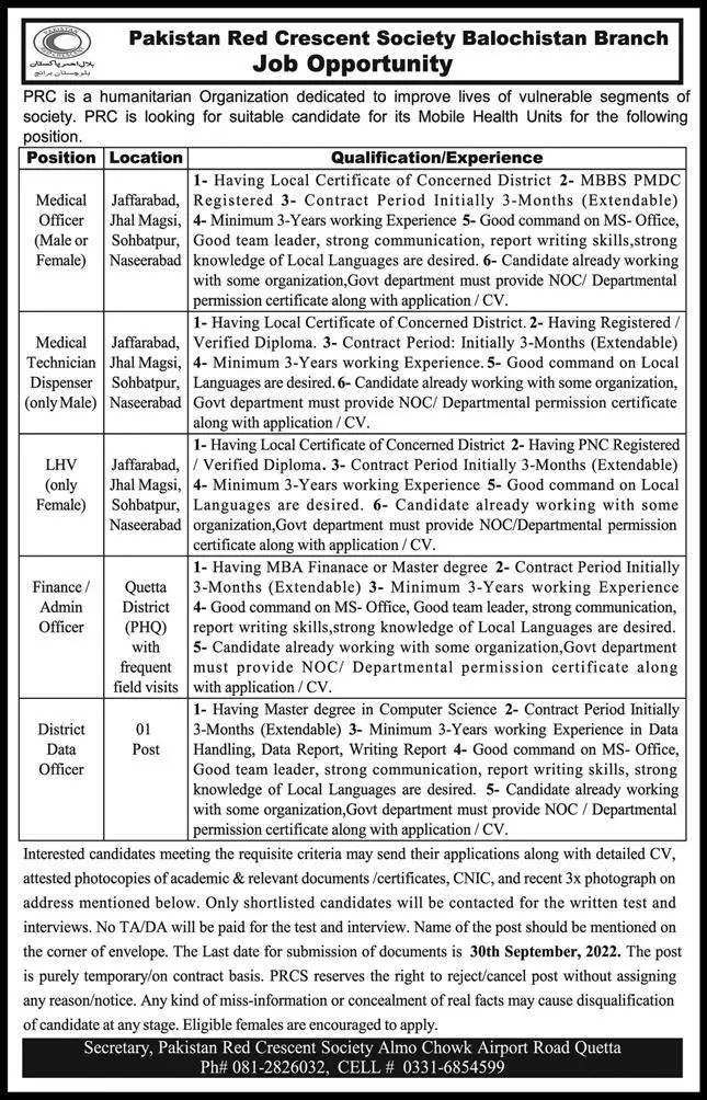 Pakistan Red Crescent Society PRCS is looking for candidates for following posts as per job advertisement published in daily Express Newspaper of September 28, 2022 for location Quetta, naseerabad, jaffarabad and sohbatpur Balochistan Pakistan: admin officer dispenser medical technician finance officer district data officer female medical officer lhv and medical officer Persons with Bachelor, Matric, DAE, Others, Master, MBA, MBBS and Intermediate etc.