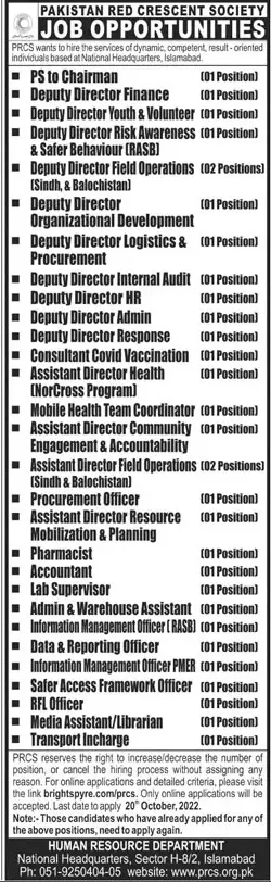 - Pakistan Red Crescent Society PRCS Islamabad, islamabad Islamabad Pakistan invites applications from eligible candidates for the post of trasport incharge, deputy director hr, ps to chairman, consultant covid vaccination, admin warehouse assistant, deputy director finance, deputy director response, assistant director health, procurement officer, lab supervisor, media assistant, rfl officer, data reporting officer, deputy director internal audit, deputy director youth volunteer, assistant director resource mobilization planning, deputy director logistic procurement, assistant director community engagement accountability, safer access framework officer, pharmacist, mobile health team coordinator, deputy director risk awareness safer behaviour, accountant, information management officer, deputy director field operation, assistant director field operations, deputy director organizational development and deputy director admin as per advertisement of October 7, 2022 published in daily Jang Newspaper.