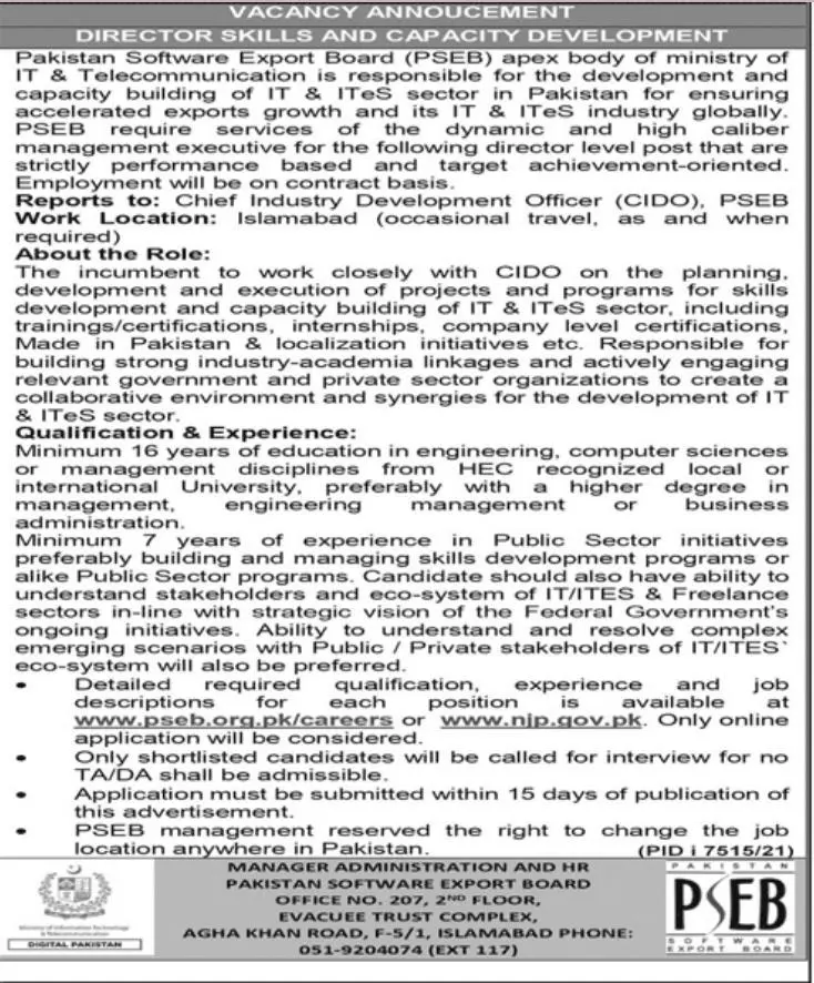 Jobs In Pakistan Software Export Board announce the Contract career opportunities for the post of See Below Ad in Federal, Islamabad for the fresh and experienced candidates on Contract basis who have Check Advertisement degree. Posted date of this post is 26/04/2022 and the last date is 11/05/2022. if you are eligible for this job apply before due date.