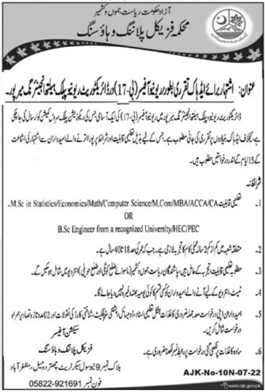 Jobs in Physical planning & housing Department Azad Kashmir announce the Adhoc career opportunities for the post of See Below Ad in Azad Jammu Kashmir, Muzaffarabad for the fresh and experienced candidates on Adhoc basis who have Check Advertisement degree. Posted date of this post is 15/07/2022 and the last date is 30/07/2022. if you are eligible for this job apply before due date.