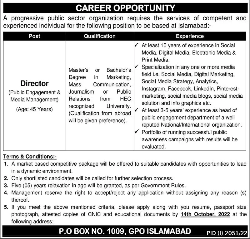 - A Public Sector Organization is seeking applications from suitable applicants for its latest recruitment. This vacancy announcement is published as PO Box No 1009 GPO Islamabad Jobs Advertisement 2022.