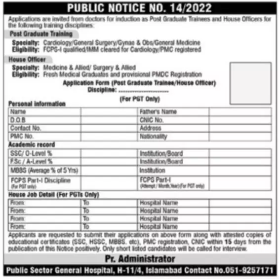 Jobs in Public sector General hospital Islamabad announce the Contract career opportunities for the post of See Below Ad in Federal, Islamabad for the fresh and experienced candidates on Contract basis who have Check Advertisement degree. Posted date of this post is 29/06/2022 and the last date is 14/07/2022. if you are eligible for this job apply before due date.
