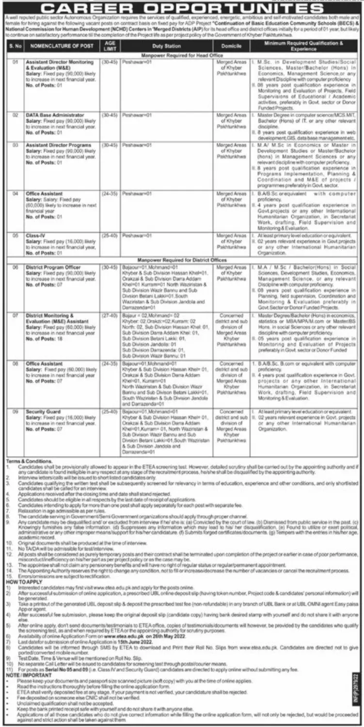 Jobs in Public Sector Organization announce the Contract career opportunities for the post of See Below Ad in Khyber Pakhtunkhwa, Peshawar for the fresh and experienced candidates on Contract basis who have Check Advertisement degree. Posted date of this post is 27/05/2022 and the last date is 15/06/2022. if you are eligible for this job apply before due date.
