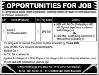 Jobs in Public Sector Organization announce the Contract career opportunities for the post of See Below Ad in Punjab, Rawalpindi for the fresh and experienced candidates on Contract basis who have Check Advertisement degree. Posted date of this post is 31/05/2022 and the last date is 13/06/2022. if you are eligible for this job apply before due date.