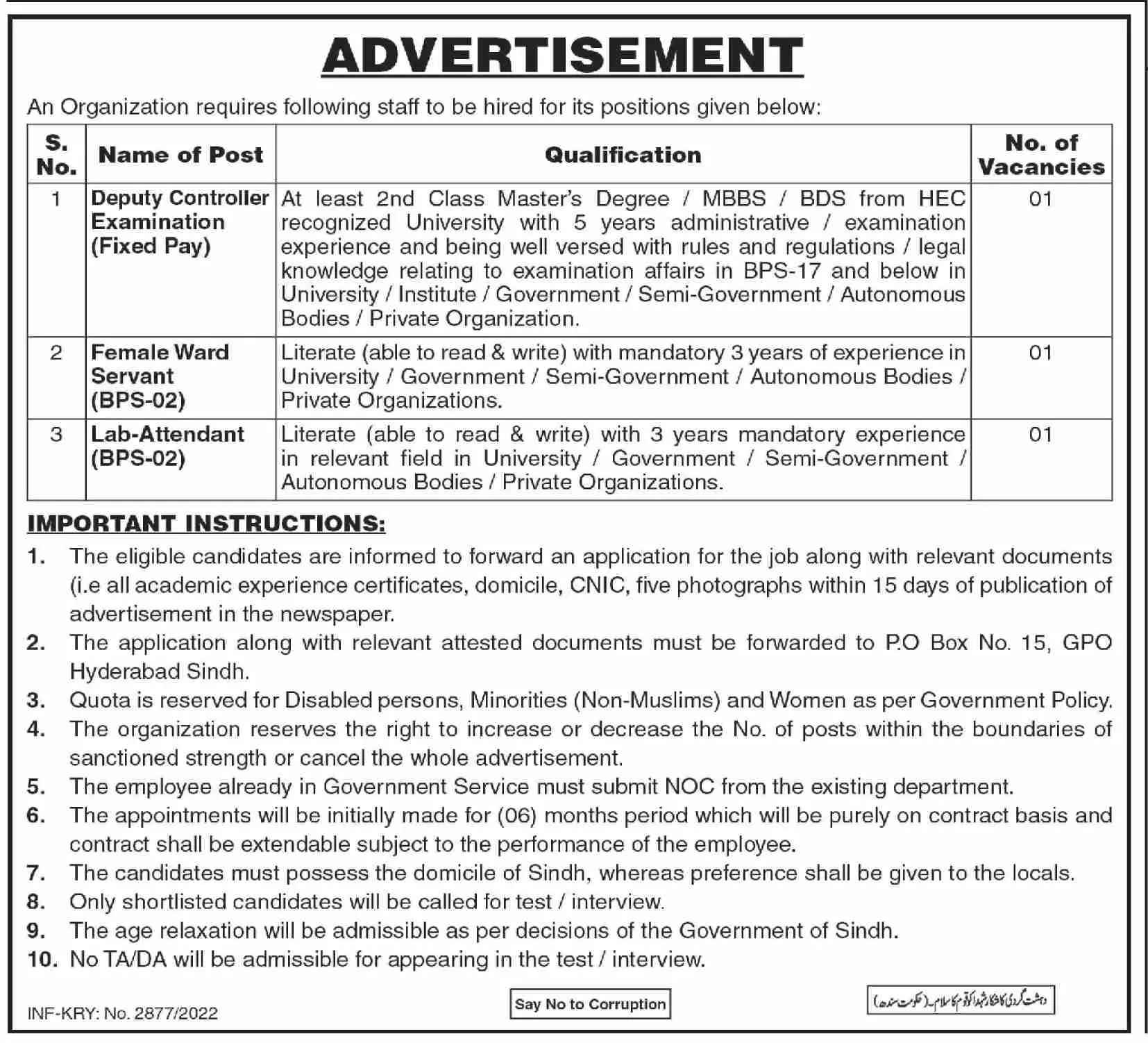Jobs in Public Sector Organization announce the Contract career opportunities for the post of See Below Ad in Sindh, Karachi for the fresh and experienced candidates on Contract basis who have Check Advertisement degree. Posted date of this post is 23/06/2022 and the last date is 08/07/2022. if you are eligible for this job apply before due date.