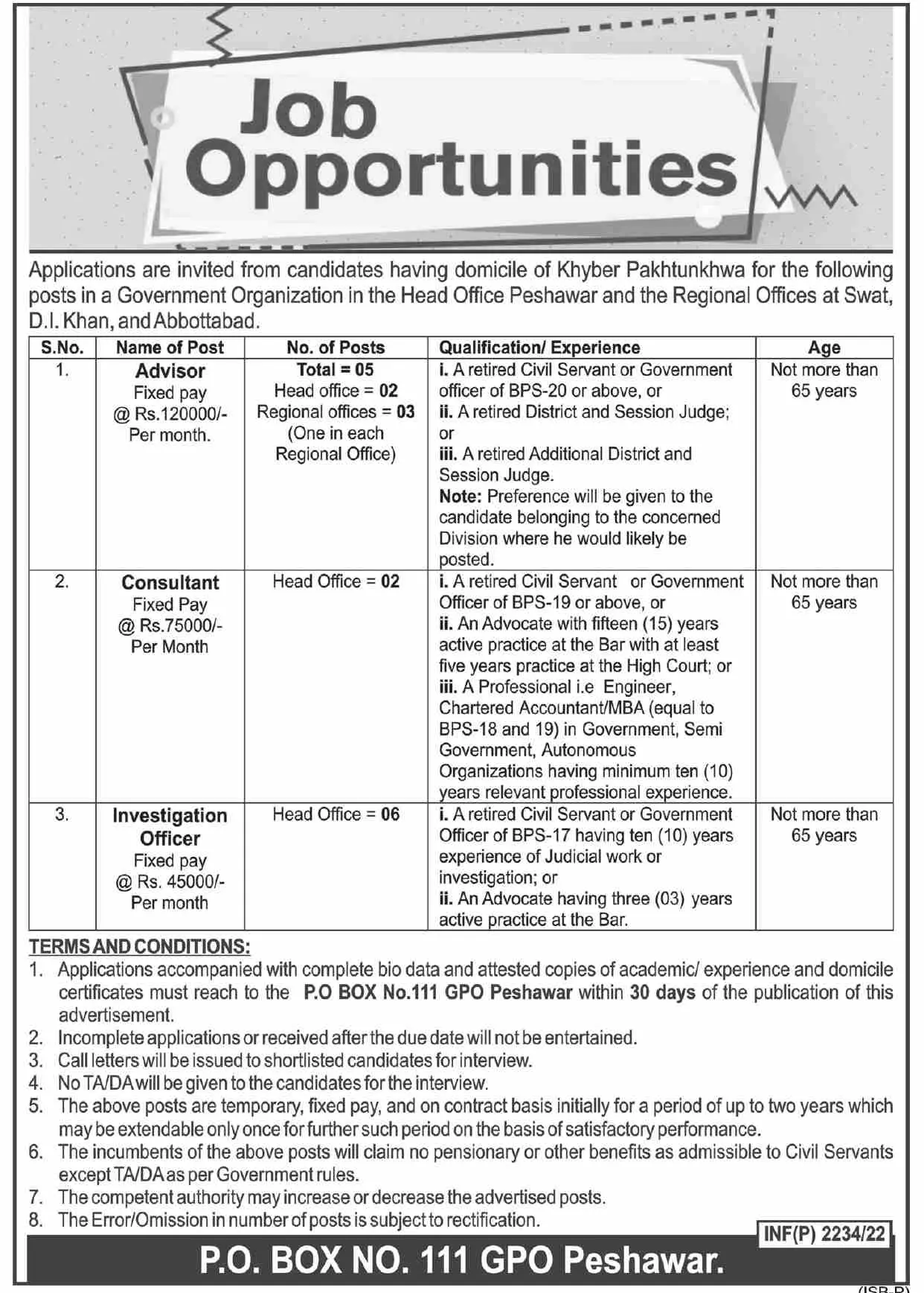 Jobs In Public sector Organization Khyber Pakhtunkhwa announce the Contract career opportunities for the post of See Below Ad in Khyber Pakhtunkhwa,Abbottabad for the fresh and experienced candidates on Contract basis who have Check Advertisement degree. Posted date of this post is 23/04/2022 and the last date is 23/05/2022. if you are eligible for this job apply before due date.