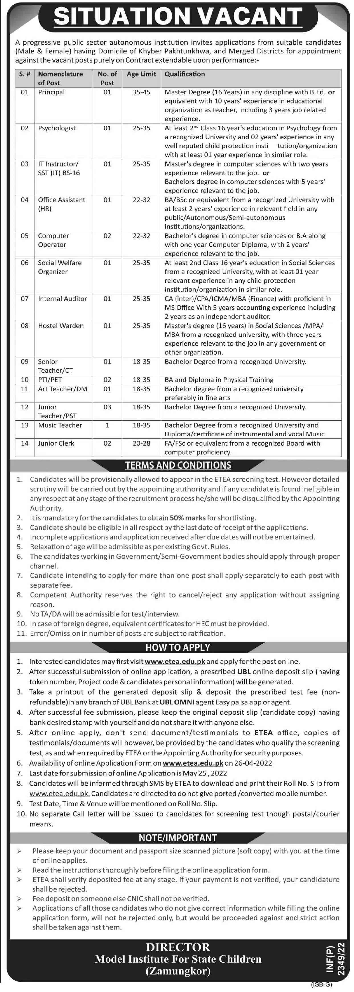 Jobs In Public Sectors Autonomous Institution announce the Contract career opportunities for the post of See Below Ad in Khyber Pakhtunkhwa, Peshawar for the fresh and experienced candidates on Contract basis who have Check Advertisement degree. Posted date of this post is 28/04/2022 and the last date is 25/05/2022. if you are eligible for this job apply before due date.