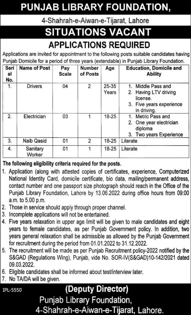 Jobs in Punjab Library Foundation Lahore announce the Contract career opportunities for the post of See Below Ad in Punjab, Lahore for the fresh and experienced candidates on Contract basis who have Check Advertisement degree. Posted date of this post is 30/05/2022 and the last date is 13/06/2022. if you are eligible for this job apply before due date.