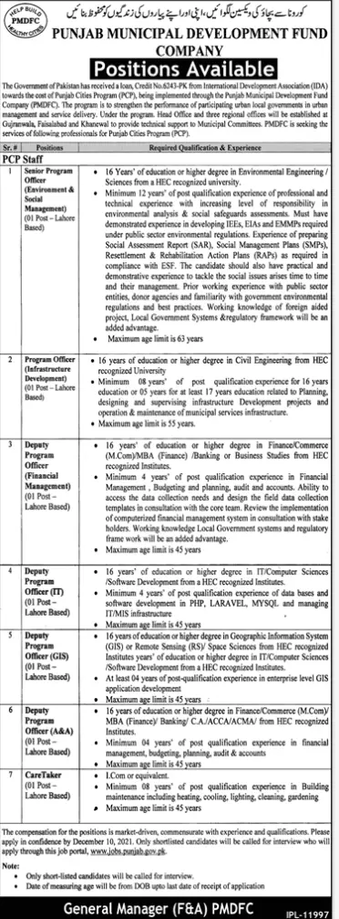 Jobs In Punjab Municipal Development Fund Company announce the Contract career opportunities for the post of check the advertisement in Punjab for the fresh and experienced candidates on Contract basis who have Check Advertisement degree. Posted date of this post is 24/11/2021 and the last date is 10/12/2021. if you are eligible for this job apply before due date.