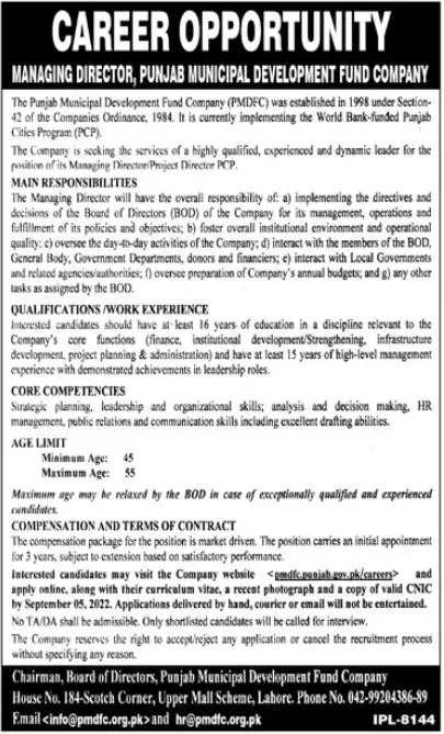 Punjab Municipal Development Fund Company PMDFC invites applications for job positions advertised in daily Jang dated 12 August 2022 for following vacancies in Lahore, lahore Punjab Pakistan. managing director Preferred Education is Bachelor, Master and MS etc.