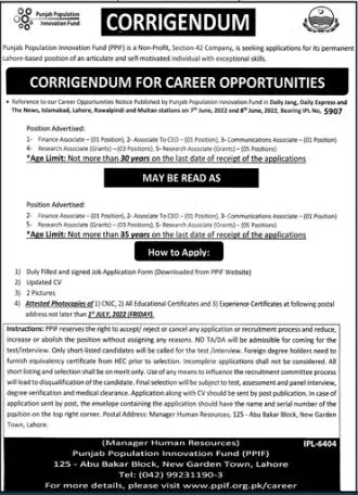 Jobs in Punjab Population Innovation Fund PPIF announce the Contract career opportunities for the post of See Below Ad in Punjab, Lahore for the fresh and experienced candidates on Contract basis who have Check Advertisement degree. Posted date of this post is 20/06/2022 and the last date is 01/07/2022. if you are eligible for this job apply before due date.