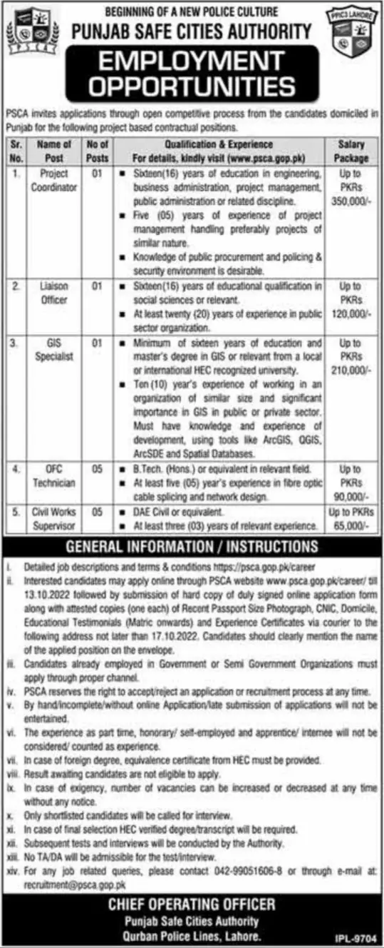 Jobs in Punjab Safe Cities Authority PSCA 2022 announce the Contract career opportunities for the post of See Below Ad in Punjab, Lahore for the fresh and experienced candidates on Contract basis who have Check Advertisement degree. Posted date of this post is 29/09/2022 and the last date is 17/10/2022. if you are eligible for this job apply before due date.