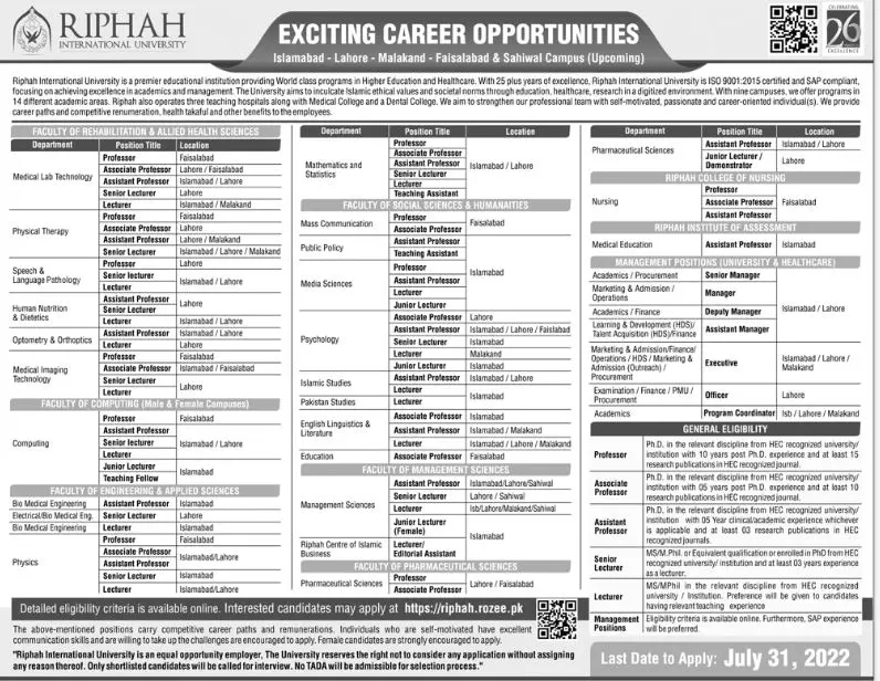 - Interested candidates apply ONLINE through Riphah Job Portal http://riphah.rozee.pk