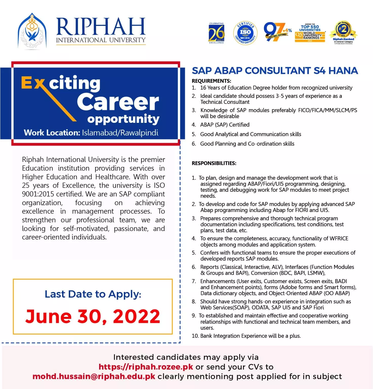 Jobs in Riphah International University announce the Contract career opportunities for the post of See Below Ad in Punjab, Rawalpindi for the fresh and experienced candidates on Contract basis who have Check Advertisement degree. Posted date of this post is 18/06/2022 and the last date is 30/06/2022. if you are eligible for this job apply before due date.