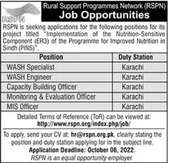- Rural Support Programmes Network RSPN invites applications for job positions advertised in daily The News dated 28 September 2022 for following vacancies in Karachi, karachi Sindh Pakistan. wash engineer mis officer wash specialist capacity building officer and monitoring evaluation officer Preferred Education is Matric, Master, Intermediate and Bachelor etc.