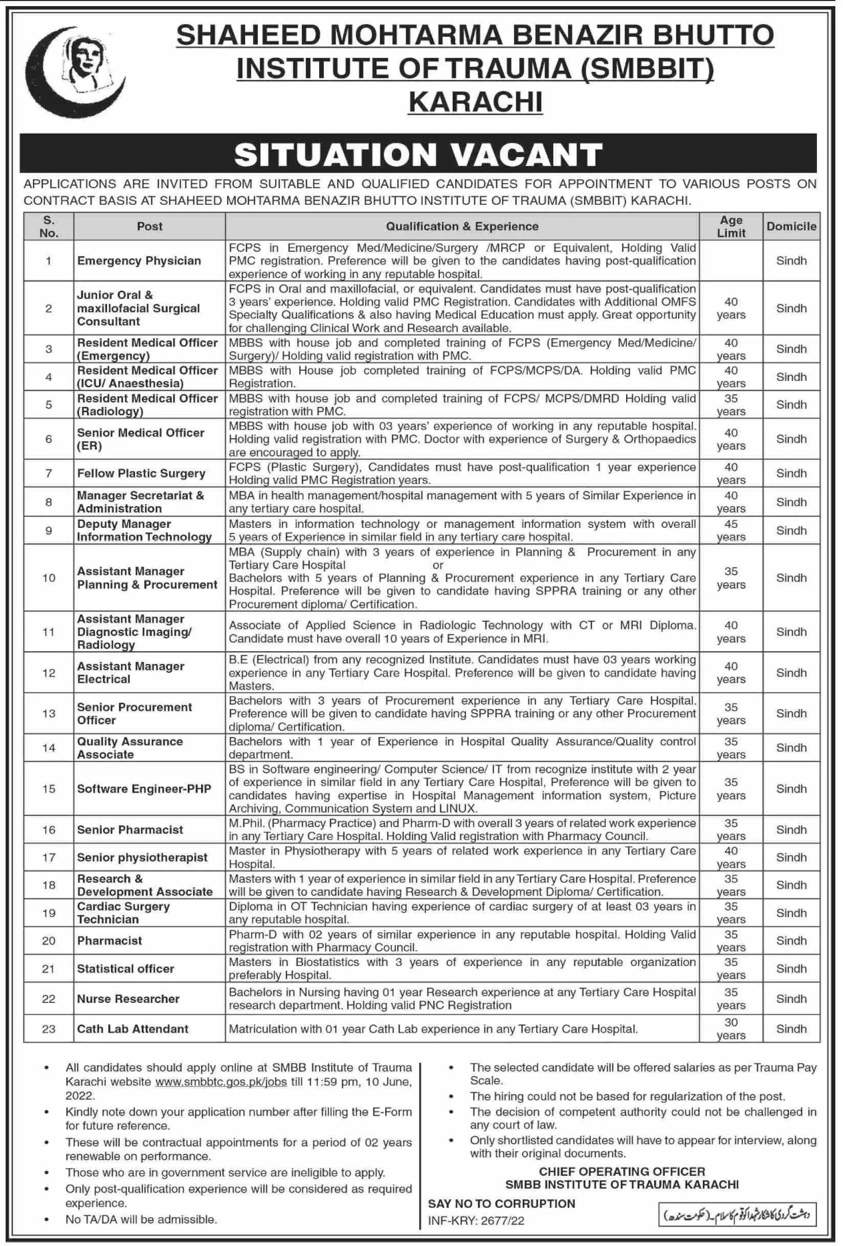 Jobs in Shaheed Mohtarma Benazir Bhutto Institute of Trauma announce the Contract career opportunities for the post of See Below Ad in Sindh, Karachi for the fresh and experienced candidates on Contract basis who have Check Advertisement degree. Posted date of this post is 05/06/2022 and the last date is 10/06/2022. if you are eligible for this job apply before due date.