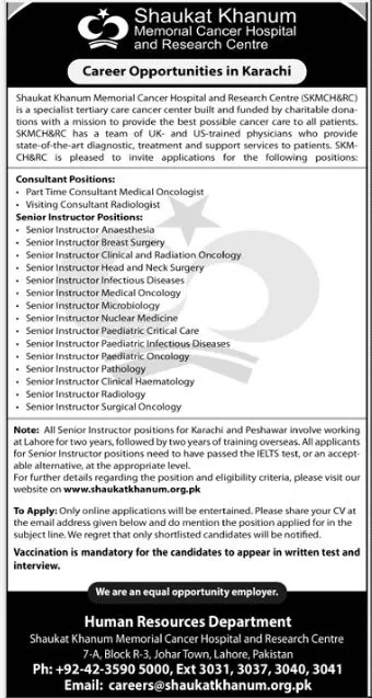 Jobs In Shaukat Khanum Hospital Lahore announce the Contract career opportunities for the post of See Below Ad in Punjab, Lahore for the fresh and experienced candidates on Contract basis who have Check Advertisement degree. Posted date of this post is 08/05/2022 and the last date is 25/05/2022. if you are eligible for this job apply before due date.