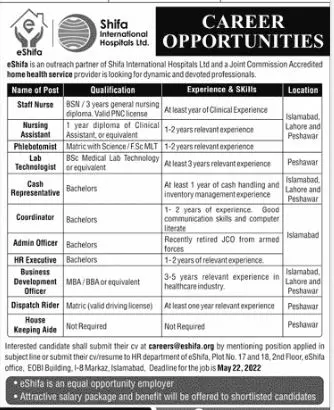 Jobs In Shifa International Hospital, Islamabad announce the Contract career opportunities for the post of See Below Ad in Federal, Islamabad for the fresh and experienced candidates on Contract basis who have Check Advertisement degree. Posted date of this post is 24/04/2022 and the last date is 22/05/2022. if you are eligible for this job apply before due date.