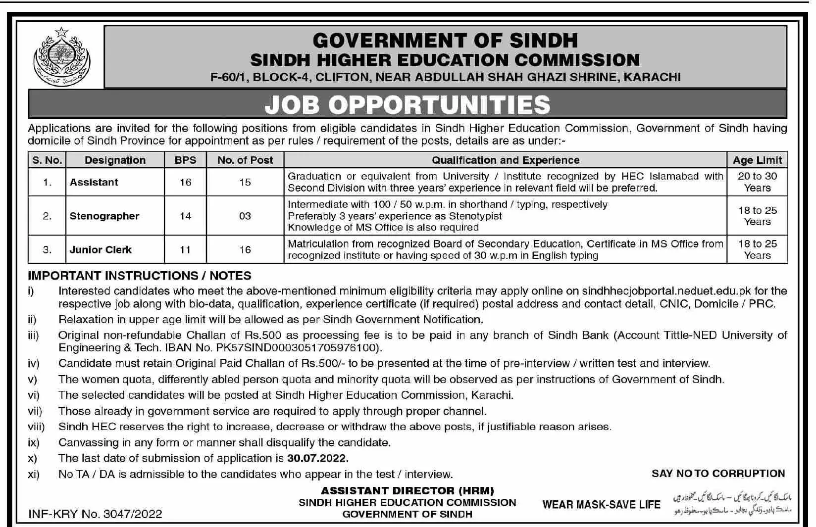Jobs in Sindh Higher Education Commission announce the Contract career opportunities for the post of See Below Ad in Sindh, Karachi for the fresh and experienced candidates on Contract basis who have Check Advertisement degree. Posted date of this post is 15/07/2022 and the last date is 30/07/2022. if you are eligible for this job apply before due date.