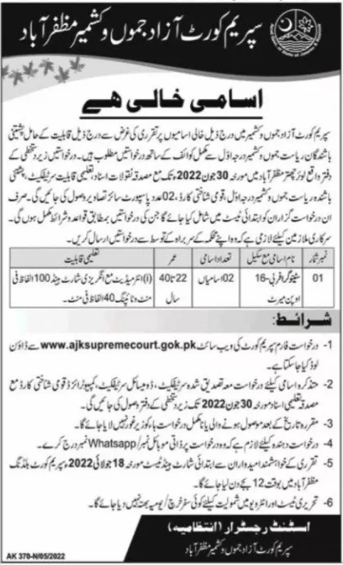 Jobs in Supreme Court of Azad Jammu and Kashmir announce the Contract career opportunities for the post of See Below Ad in Azad Jammu Kashmir, Muzaffarabad for the fresh and experienced candidates on Contract basis who have Check Advertisement degree. Posted date of this post is 01/06/2022 and the last date is 30/06/2022. if you are eligible for this job apply before due date.