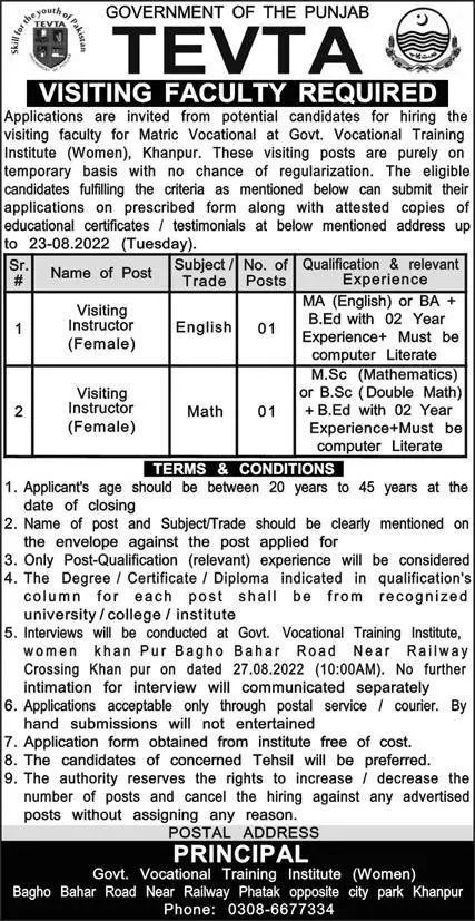 Technical Education & Vocational Training Authority TEVTA latest Government Teaching jobs and others can be applied till 27 August 2022 or as per closing date in newspaper ad.