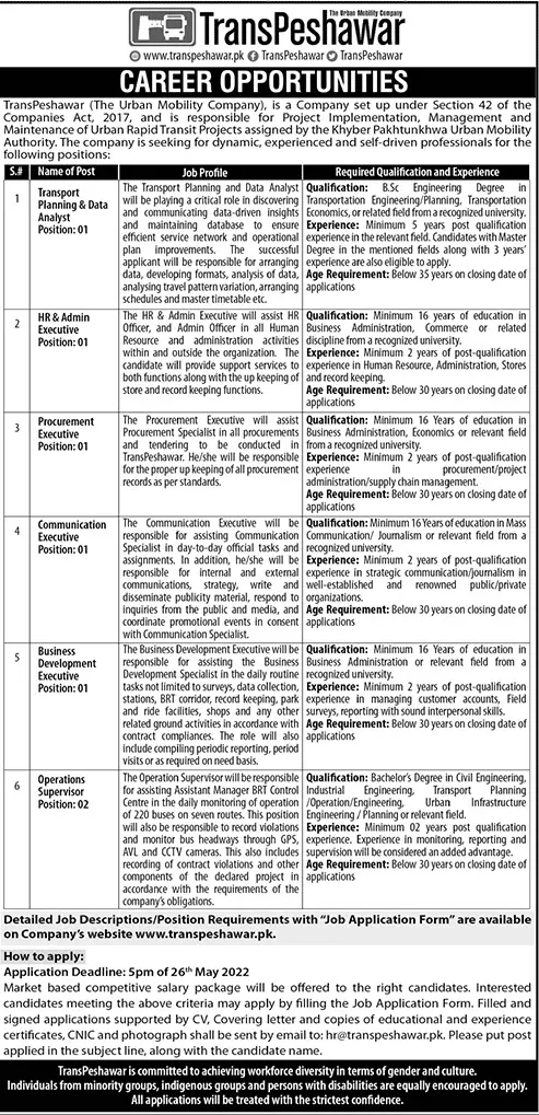 Jobs In Trans Peshawar announce the Contract career opportunities for the post of See Below Ad in Khyber Pakhtunkhwa, Peshawar for the fresh and experienced candidates on Contract basis who have Check Advertisement degree. Posted date of this post is 12/05/2022 and the last date is 26/05/2022. if you are eligible for this job apply before due date.