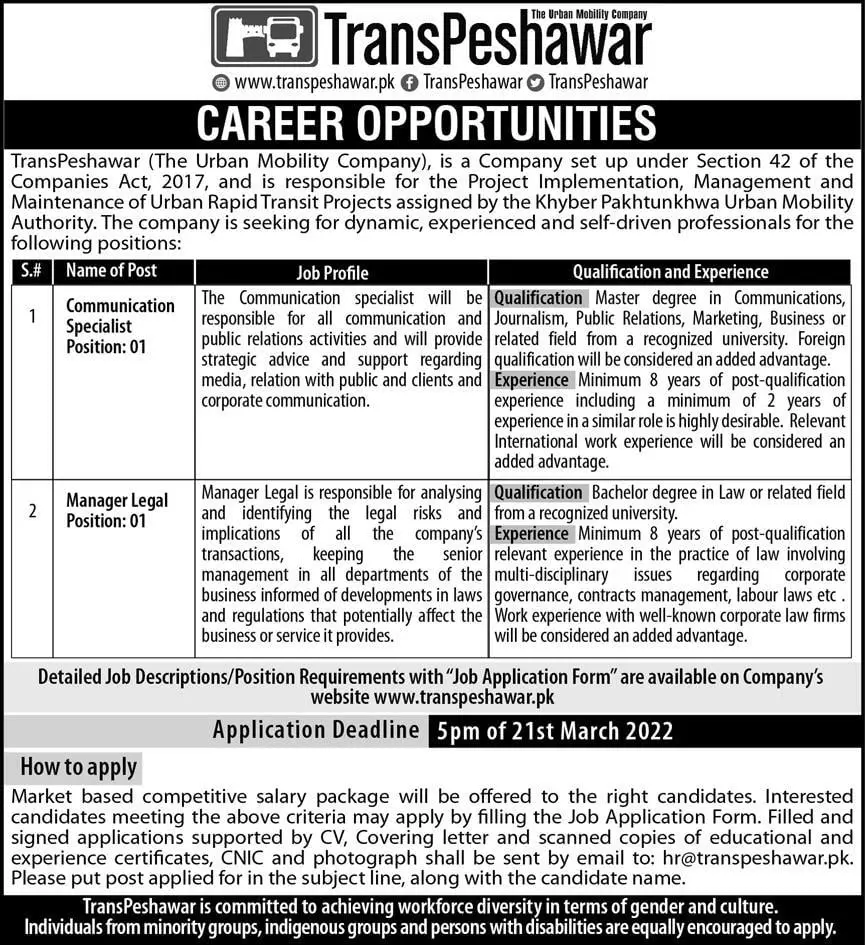 Jobs in TransPeshawar KPK announce the Contract career opportunities for the post of See Below Ad in Khyber Pakhtunkhwa,Peshawar for the fresh and experienced candidates on Contract basis who have Check Advertisement degree. Posted date of this post is 06/03/2022 and the last date is 21/03/2022. if you are eligible for this job apply before due date.