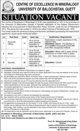 Jobs In University of Balochistan Quetta announce the Permanent career opportunities for the post of See Below Ad in Balochistan, Quetta for the fresh and experienced candidates on Permanent basis who have Check Advertisement degree. Posted date of this post is 05/03/2022 and the last date is 22/03/2022. if you are eligible for this job apply before due date.