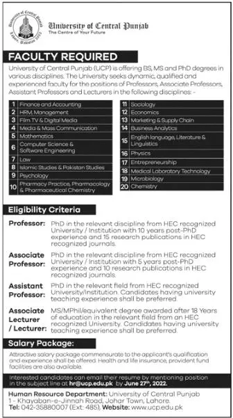 Jobs in University of Central Punjab UCP announce the Contract career opportunities for the post of See Below Ad in Punjab, Lahore for the fresh and experienced candidates on Contract basis who have Check Advertisement degree. Posted date of this post is 05/06/2022 and the last date is 27/06/2022. if you are eligible for this job apply before due date.