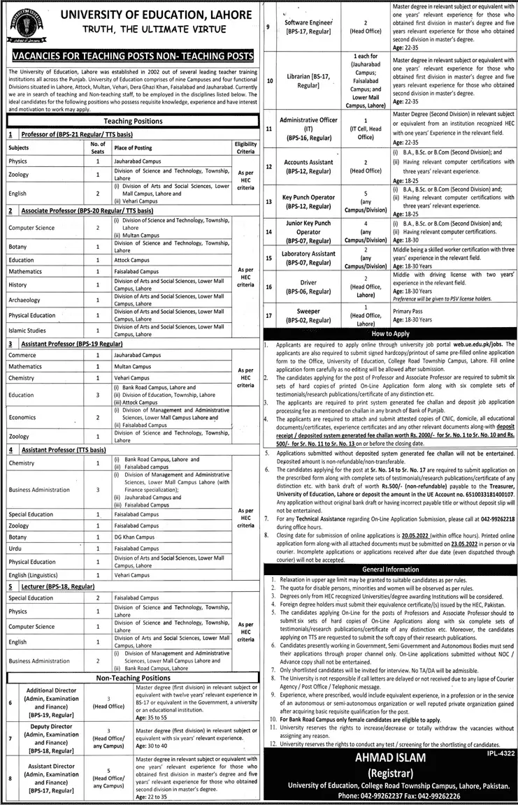 Jobs In University of Education Lahore announce the Permanent career opportunities for the post of See Below Ad in Punjab, Lahore for the fresh and experienced candidates on Permanent basis who have Check Advertisement degree. Posted date of this post is 22/04/2022 and the last date is 20/05/2022. if you are eligible for this job apply before due date.