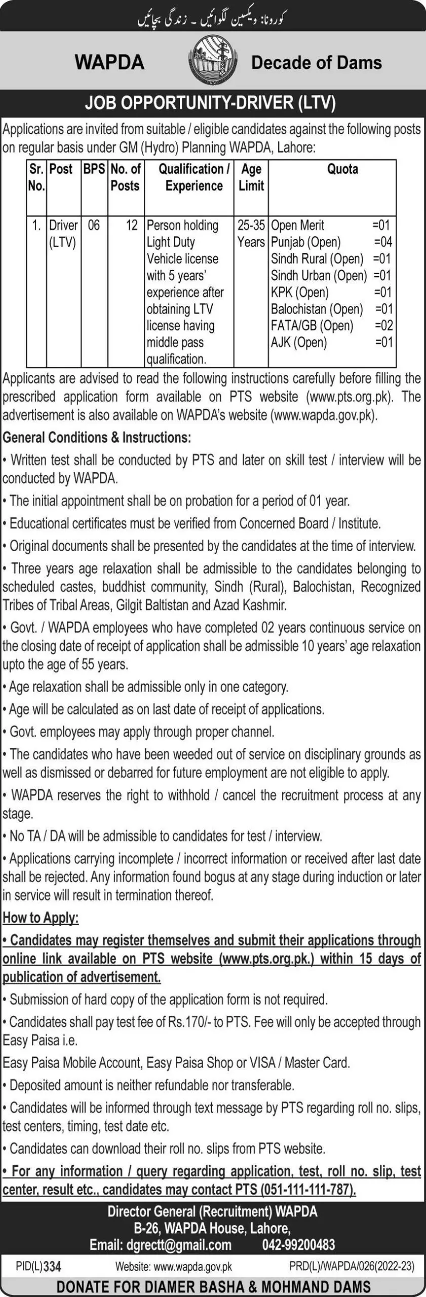 Applicants are advised to read the following instructions carefully before filling out the prescribed application form available on the PTS website (www.pts.org.pk). The advertisement is also available on WAPDA’s website (www.wapda.gov.pk). Instructions & General Conditions