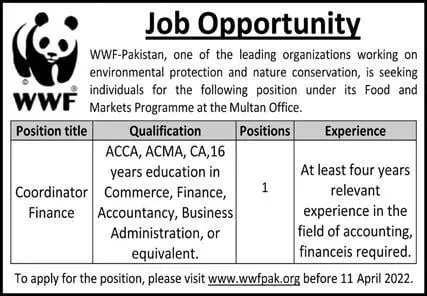 Jobs In World Wide Fund Punjab announce the Contract career opportunities for the post of See Below Ad in Punjab, Multan for the fresh and experienced candidates on Contract basis who have Check Advertisement degree. Posted date of this post is 07/04/2022 and the last date is 11/04/2022. if you are eligible for this job apply before due date.