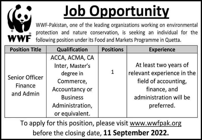 Jobs In World Wide Fund WWF Balochistan announce the Contract career opportunities for the post of See Below Ad in Balochistan, Quetta for the fresh and experienced candidates on Contract basis who have Check Advertisement degree. Posted date of this post is 06/09/2022 and the last date is 11/09/2022. if you are eligible for this job apply before due date.