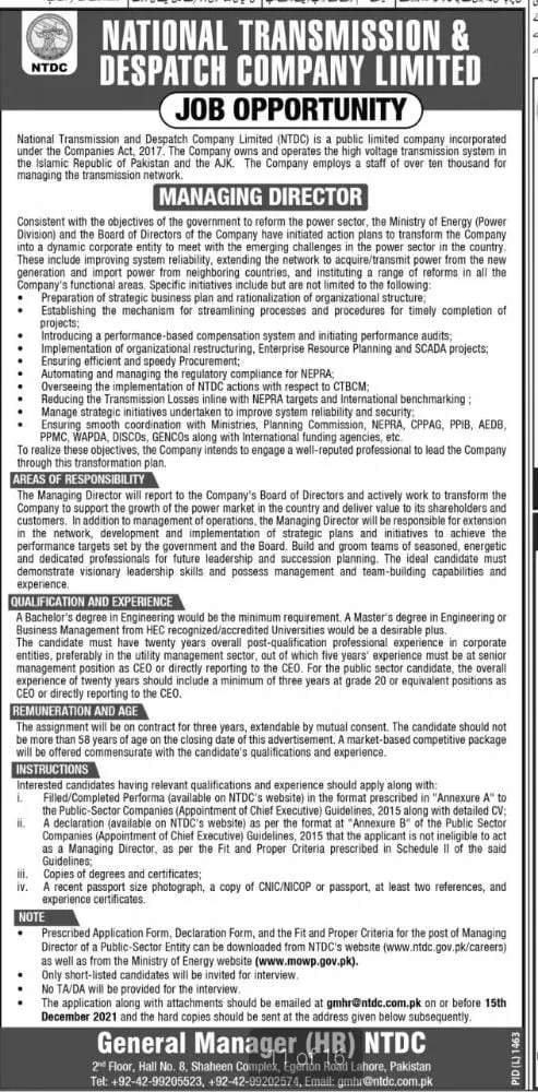 Jobs National Transmission Dispatch Company NTDC announce the Contract career opportunities for the post of check the advertisement in Punjab,Lahore for the fresh and experienced candidates on Contract basis who have Check Advertisement degree. Posted date of this post is 21/11/2021 and the last date is 15/12/2021. if you are eligible for this job apply before due date.